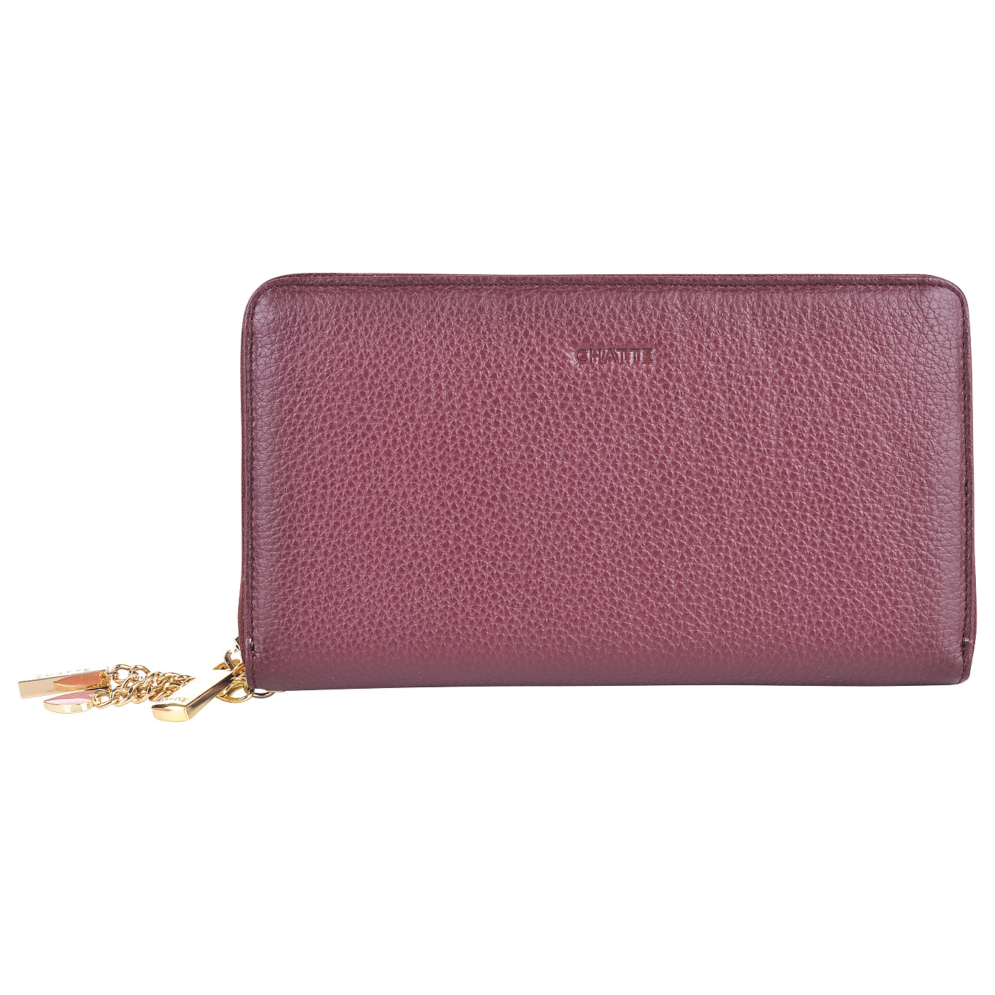 Закрывается на молнию. Внутри три отделения для купюр, разделенные карманом на молнии для мелочи и перегородкой, два открытых кармана и кармашки для пластиковых карточек.
